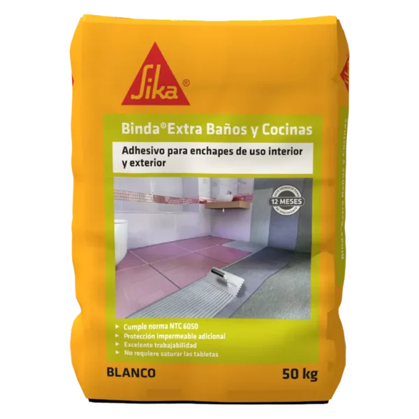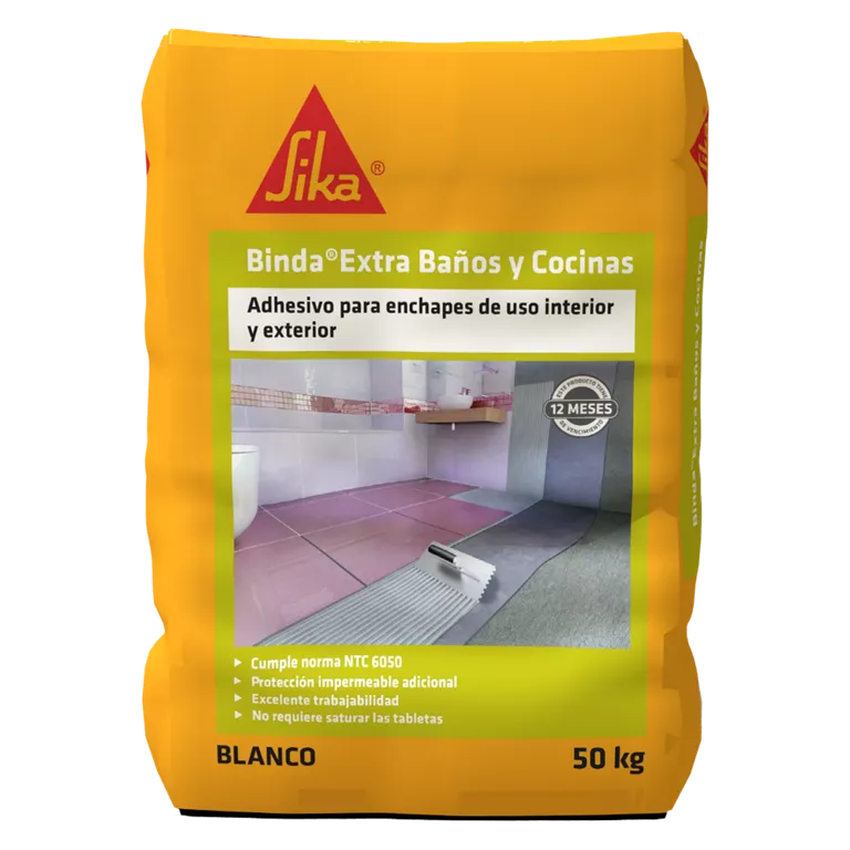 Sika® Binda® Extra Baños y Cocinas es un adhesivo para enchape con largo tiempo de manejabilidad, elaborado con base en cemento, especialmente formulado con características de protección adicional a la impermeabilización contra el paso del agua; de color blanco o gris.