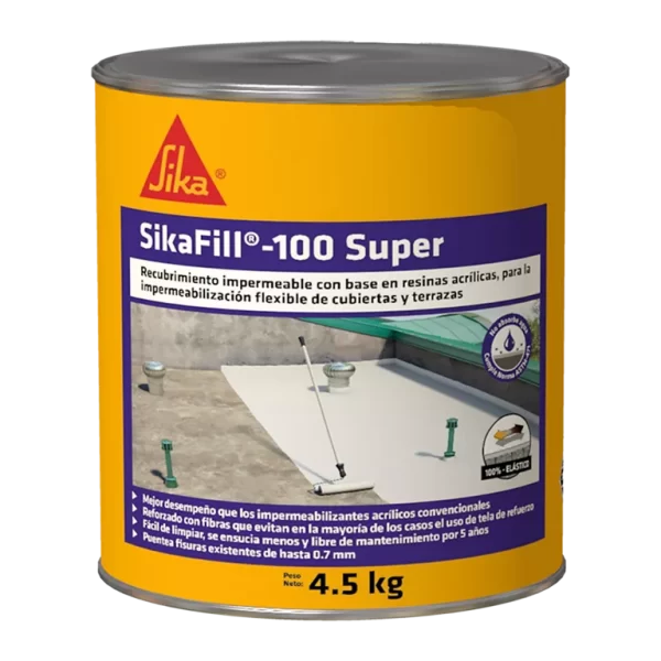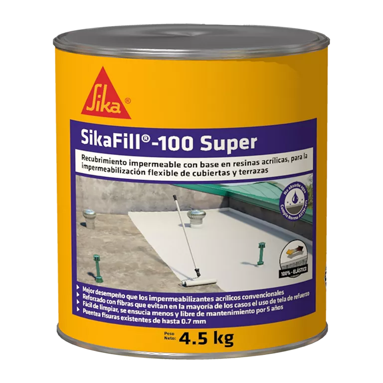SikaFill®-100 Super CO es una membrana líquida aplicada, elástica a base de resinas acrílicas para la impermeabilización flexible de cubiertas, techos y terrazas, tanto en obra nueva como en superficies que ya han sido impermeabilizadas (mantenimiento).